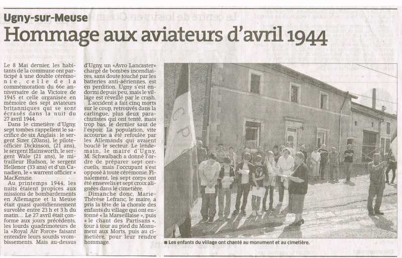 I see the two articles in local French newspapers just after 8th May 2014. It is a real pity that the journalists still have a lot of wrong information - some names of the air crew have the wrong spelling (example 'Hellenor' and not 'Ellenor' as it should be). They have the age of some crew members wrong. The article appears to say the Lancaster bomber was 'touche par les batteries anti-aeriannes allemandes' (shot by German anti-aircraft guns). This is wrong ! They were shot down by a German Messchersmidt. We know the facts. Why do the French newspapers keep on publishing the same incorrect facts ? If the local newspaper wants to write a story about this again I would like to give them the correct information, so if anybody knows which newspapers these stories were published in and an e-Mail address for the journalist or the editor then I would be very happy to contact the newspapers and give them accurate information. Please let me know. gxmartinbaker@hotmail.com
